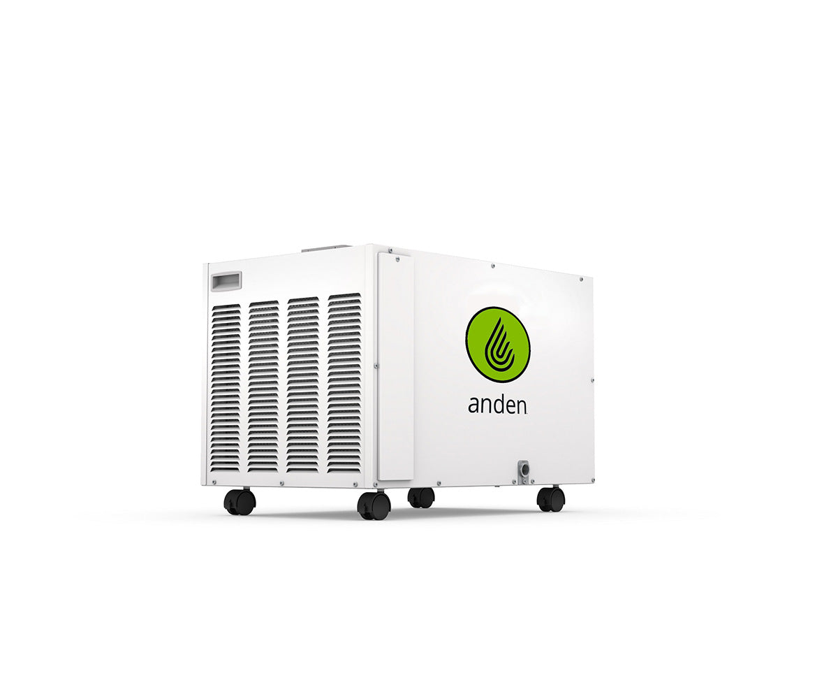 A130F DehumidifierGrow environments require high-capacity, specially-designed dehumidifiers to control humidity and protect crops. The Anden Model A130 delivers performance, capacity and reliability that is not available from the portable units sold via retail. With 130 pints per day removal capacity, integration with smart controls and a 5-year warranty, you can trust Anden to protect your crop.